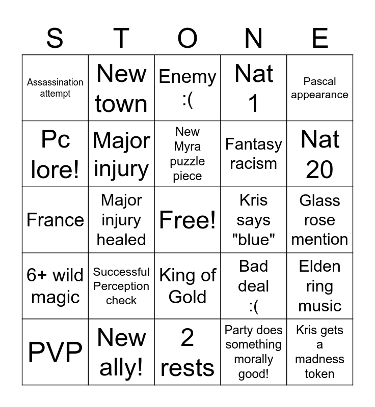 This bingo card has a free space and 24 words: Successful Perception check, New ally!, New Myra puzzle piece, PVP, Pascal appearance, Assassination attempt, Pc lore!, New town, Kris says "blue", King of Gold, Fantasy racism, France, Bad deal :(, Elden ring music, Major injury, Party does something morally good!, Glass rose mention, Enemy :(, Nat 20, Major injury healed, Kris gets a madness token, 6+ wild magic, Nat 1 and 2 rests.