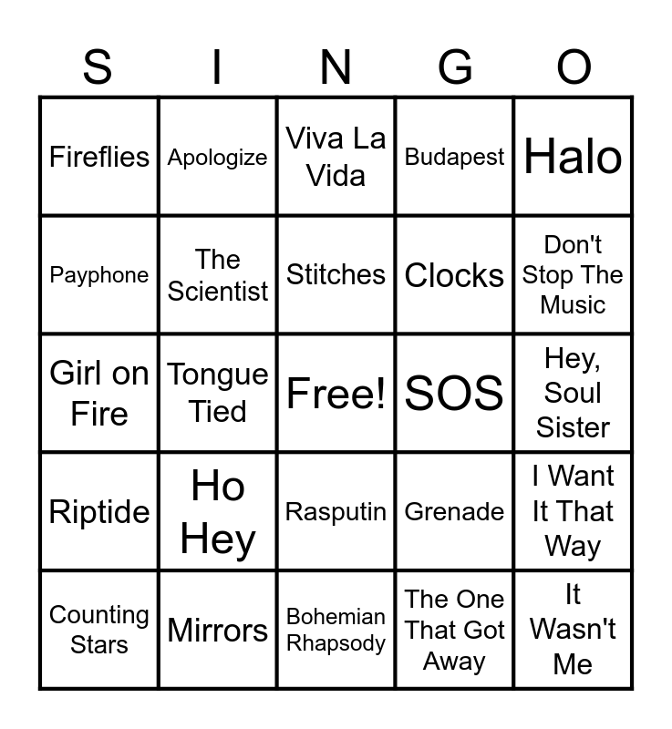 This bingo card has a free space and 71 words: All Of Me, Apologize, Baby, Billie Jean, Bohemian Rhapsody, Boyfriend, Budapest, Chandelier, Clocks, Cooler Than Me, Counting Stars, Diamonds, Don't Stop The Music, Fireflies, Forget You, Girl on Fire, Grenade, Halo, Happier, Hey, Soul Sister, Ho Hey, It Wasn't Me, I Want It That Way, Just The Way You Are, Last Friday Night (T.G.I.F.), The Lazy Song, Lights, Locked Out Of Heaven, Lost Boy, Love You Like A Love Song, Mirrors, Moves Like Jagger, Mr. Brightside, One Dance, The One That Got Away, Only Girl (In The World), One The Floor, Party In The U.S.A., Payphone, Pompeii, Rasputin, Replay, Riptide, Rocketeer, Royals, Rude, Same Old Love, The Scientist, Set Fire To The Rain, Since You Been Gone, Somebody That I Used To Know, Someone Like You, SOS, Stay, Stay With Me, Stereo Hearts, Stitches, Summer, The Sweet Escape, Take Me To Church, Talking To The Moon, Titanium, Tongue Tied, Toxic, Treat You Better, Umbrella, Viva La Vida, We Found Love, What Makes You Beautiful, Written In The Stars and You Belong With Me.