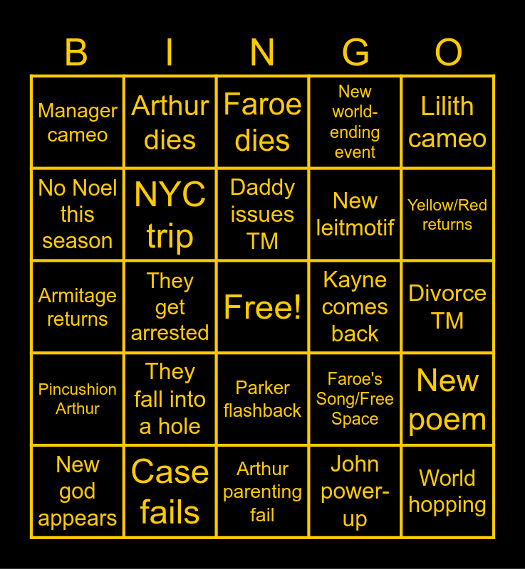 This bingo card has a free space and 25 words: They fall into a hole, Arthur parenting fail, Daddy issues TM, New god appears, Lilith cameo, Manager cameo, No Noel this season, Arthur dies, Kayne comes back, Parker flashback, New leitmotif, Armitage returns, Faroe's Song/Free Space, New poem, NYC trip, New McGuffin, Divorce TM, Faroe dies, Yellow/Red returns, They get arrested, World hopping, Case fails, Pincushion Arthur, New world-ending event and John power-up.