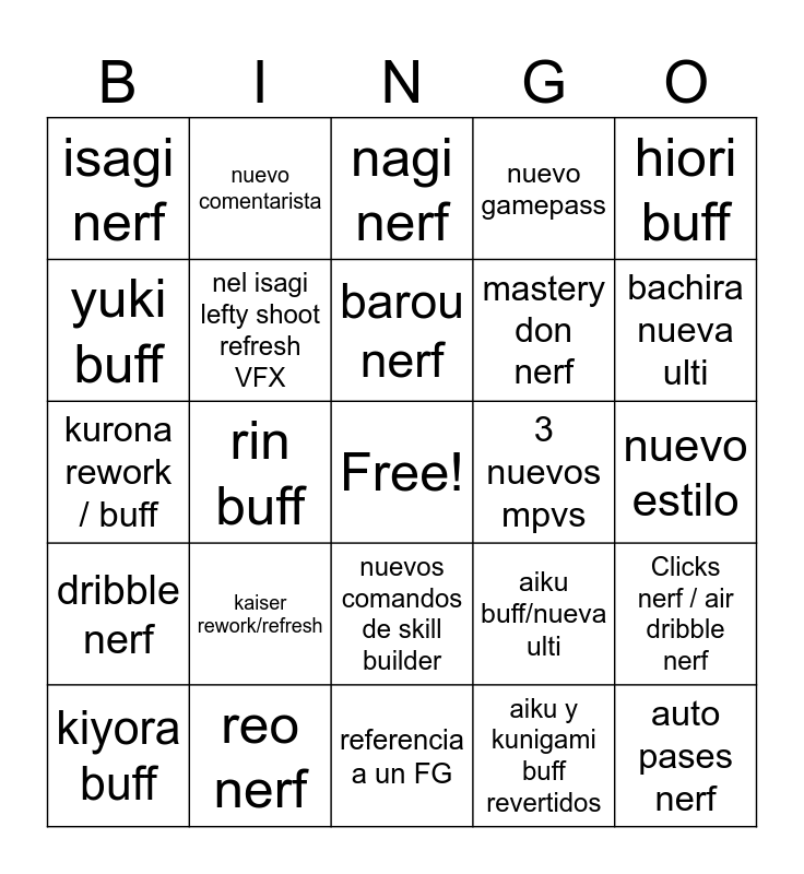 This bingo card has a free space and 24 words: kaiser rework/refresh, reo nerf, barou nerf, kiyora buff, hiori buff, isagi nerf, yuki buff, nuevo comentarista, 3 nuevos mpvs, nuevos comandos de skill builder, mastery don nerf, kurona rework / buff, aiku buff/nueva ulti, Clicks nerf / air dribble nerf, nel isagi lefty shoot refresh VFX, aiku y kunigami buff revertidos, nuevo estilo, nagi nerf, bachira nueva ulti, rin buff, auto pases nerf, dribble nerf, nuevo gamepass and referencia a un FG.