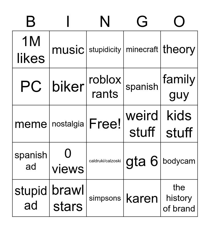 This bingo card has a free space and 24 words: 0 views, brawl stars, roblox rants, stupid ad, theory, 1M likes, PC, music, weird stuff, caldruki/calzoski, spanish, meme, gta 6, bodycam, biker, karen, kids stuff, stupidicity, family guy, nostalgia, the history of brand, spanish ad, minecraft and simpsons.