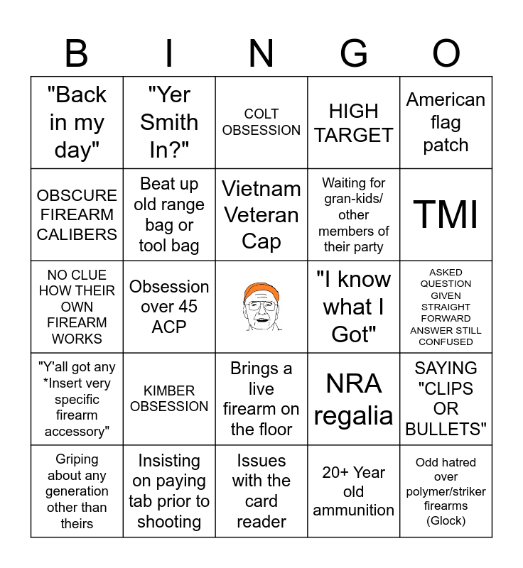 This bingo card has a free space and 24 words: KIMBER OBSESSION, Insisting on paying tab prior to shooting, Vietnam Veteran Cap, Griping about any generation other than theirs, American flag patch, "Back in my day", OBSCURE FIREARM CALIBERS, "Yer Smith In?", "I know what I Got", Brings a live firearm on the floor, Waiting for gran-kids/ other members of their party, NO CLUE HOW THEIR OWN FIREARM WORKS, NRA regalia, SAYING "CLIPS OR BULLETS", Beat up old range bag or tool bag, 20+ Year old ammunition, ASKED QUESTION GIVEN STRAIGHT FORWARD ANSWER STILL CONFUSED, COLT OBSESSION, TMI, Obsession over 45 ACP, Odd hatred over polymer/striker firearms (Glock), "Y'all got any *Insert very specific firearm accessory", HIGH TARGET and Issues with the card reader.