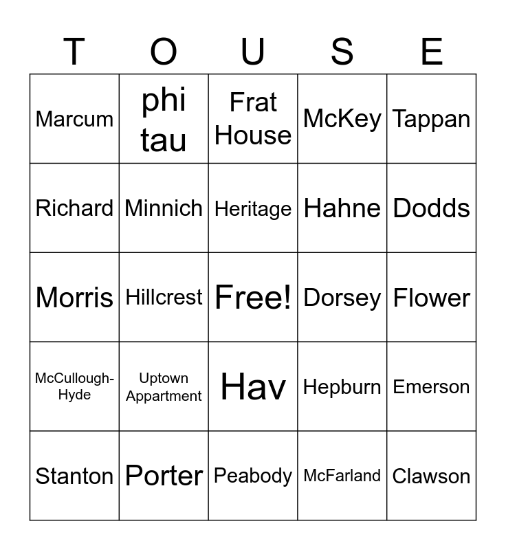 This bingo card has a free space and 24 words: Stanton, Uptown Appartment, Heritage, McFarland, Tappan, Marcum, phi tau, Frat House, Dorsey, Flower, Morris, Minnich, Hepburn, Emerson, Richard, Porter, Peabody, McKey, Dodds, McCullough-Hyde, Hillcrest, Hav, Hahne and Clawson.