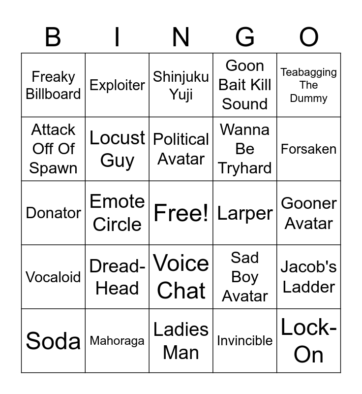 This bingo card has a free space and 36 words: Modulo Yuji, Overused Jujutsu Kaisen Avatar, Four Black-Flash Chain, Locust Guy, Sad Boy Avatar, Vocaloid, Political Avatar, Annoying Todo, Teabagging The Dummy, Instrument Player, Emote Circle, Goon Bait Kill Sound, Aspiring Mangaka Counter, Larper, Forsaken, Freaky Billboard, Second Ultimate Perfection, Dread-Head, Lock-On, Shinjuku Yuji, Gooner Avatar, Jacob's Ladder, Mahoraga, Soda, Ladies Man, Exploiter, Donator, Ten Thousand Plus Kills, Wanna Be Tryhard, Attack Off Of Spawn, "Sukuna Please", Fly Attention Span, Invincible, Voice Chat, Out Of State Server and Horse Girl Avatar.