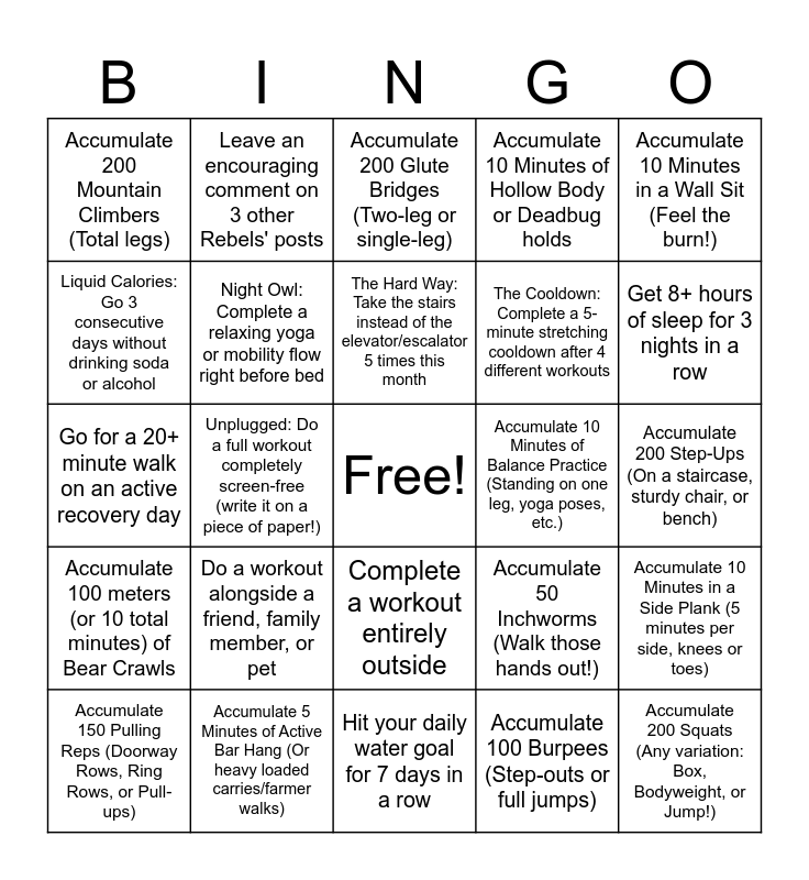 This bingo card has a free space and 45 words: Accumulate 200 Push-ups (Any variation: Wall, Incline, Knee, or Full!), Accumulate 200 Squats (Any variation: Box, Bodyweight, or Jump!), Accumulate 200 Lunges (Total legs, any variation), Accumulate 150 Pulling Reps (Doorway Rows, Ring Rows, or Pull-ups), Accumulate 200 Core Reps (Sit-ups, Crunches, or Russian Twists), Accumulate 100 Burpees (Step-outs or full jumps), Accumulate 200 Glute Bridges (Two-leg or single-leg), Accumulate 15 Minutes in a Plank (Any variation: Countertop, Knee, or Standard), Accumulate 10 Minutes in a Wall Sit (Feel the burn!), Accumulate 5 Minutes of Active Bar Hang (Or heavy loaded carries/farmer walks), Accumulate 10 Minutes of Hollow Body or Deadbug holds, Accumulate 10 Minutes of Balance Practice (Standing on one leg, yoga poses, etc.), Complete a workout entirely outside, Do a workout alongside a friend, family member, or pet, Post a "Sweaty Selfie" or Form Check video in the community, Hit your daily water goal for 7 days in a row, Stretch or do mobility work for 10+ minutes on 5 different days, Go for a 20+ minute walk on an active recovery day, Try a brand-new vegetable or healthy recipe, Get 8+ hours of sleep for 3 nights in a row, Leave an encouraging comment on 3 other Rebels' posts, Swap out one processed snack for a whole-food option today, Accumulate 300 Jumping Jacks (or low-impact Step Jacks), Accumulate 200 Mountain Climbers (Total legs), Accumulate 200 Calf Raises (Use a stair edge for a deeper stretch!), Accumulate 200 Step-Ups (On a staircase, sturdy chair, or bench), Accumulate 100 Supermans or Bird-Dogs (Protect that lower back!), Accumulate 300 High Knees (or high-knee marches), Accumulate 50 Inchworms (Walk those hands out!), Accumulate 100 meters (or 10 total minutes) of Bear Crawls, Accumulate 100 Pike Push-Ups (or overhead dumbbell presses if needed), Accumulate 10 Minutes in a Side Plank (5 minutes per side, knees or toes), Accumulate 10 Minutes in a Deep Resting Squat (Drop down while watching TV!), Accumulate 10 Minutes holding the top of a Glute Bridge (Squeeze those glutes!), Accumulate 15 Minutes of deep hamstring stretches (Over the course of the month), Unplugged: Do a full workout completely screen-free (write it on a piece of paper!), Level Up Your Brain: Read one Nerd Fitness article or a chapter of a book, Meal Prep Master: Prep at least 3 days' worth of healthy lunches or dinners in advance, Protein Power: Hit your daily protein goal for 5 days in a row, The Hard Way: Take the stairs instead of the elevator/escalator 5 times this month, Liquid Calories: Go 3 consecutive days without drinking soda or alcohol, The Cooldown: Complete a 5-minute stretching cooldown after 4 different workouts, Early Bird: Complete a workout before 8:00 AM, Night Owl: Complete a relaxing yoga or mobility flow right before bed and The Cheerleader: High-five someone (in real life or virtually) after finishing a workout.