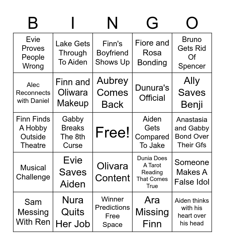 This bingo card has a free space and 24 words: Evie Saves Aiden, Nura Quits Her Job, Aubrey Comes Back, Sam Messing With Ren, Bruno Gets Rid Of Spencer, Evie Proves People Wrong, Alec Reconnects with Daniel, Lake Gets Through To Aiden, Aiden Gets Compared To Jake, Olivara Content, Dunura's Official, Finn Finds A Hobby Outside Theatre, Dunia Does A Tarot Reading That Comes True, Someone Makes A False Idol, Finn and Oliwara Makeup, Ara Missing Finn, Anastasia and Gabby Bond Over Their Gfs, Finn's Boyfriend Shows Up, Ally Saves Benji, Gabby Breaks The 8th Curse, Aiden thinks with his heart over his head, Musical Challenge, Fiore and Rosa Bonding and Winner Predictions Free Space.