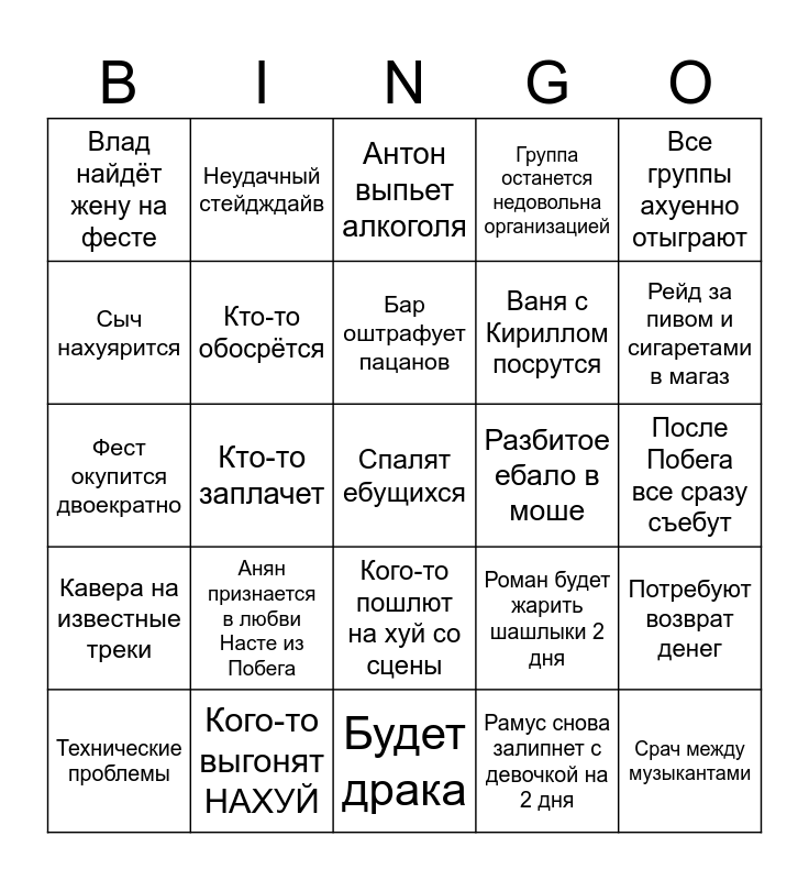 This bingo card has 25 words: Анян признается в любви Насте из Побега, Будет драка, Бар оштрафует пацанов, Технические проблемы, Все группы ахуенно отыграют, Влад найдёт жену на фесте, Сыч нахуярится, Неудачный стейдждайв, Разбитое ебало в моше, Кого-то пошлют на хуй со сцены, Ваня с Кириллом посрутся, Фест окупится двоекратно, Роман будет жарить шашлыки 2 дня, Потребуют возврат денег, Кто-то обосрётся, Срач между музыкантами, После Побега все сразу съебут, Антон выпьет алкоголя, Рейд за пивом и сигаретами в магаз, Кто-то заплачет, Спалят ебущихся, Кого-то выгонят НАХУЙ, Кавера на известные треки, Группа останется недовольна организацией and Рамус снова залипнет с девочкой на 2 дня.