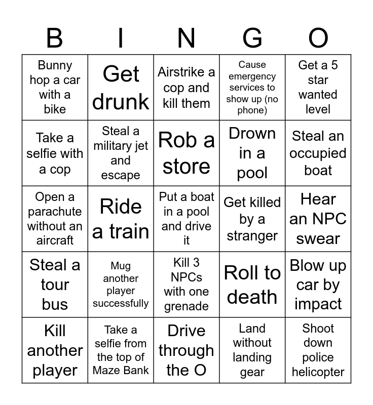 This bingo card has 25 words: Mug another player successfully, Drive through the O, Rob a store, Kill another player, Get a 5 star wanted level, Bunny hop a car with a bike, Take a selfie with a cop, Get drunk, Get killed by a stranger, Kill 3 NPCs with one grenade, Drown in a pool, Open a parachute without an aircraft, Roll to death, Blow up car by impact, Steal a military jet and escape, Shoot down police helicopter, Hear an NPC swear, Airstrike a cop and kill them, Steal an occupied boat, Ride a train, Put a boat in a pool and drive it, Take a selfie from the top of Maze Bank, Steal a tour bus, Cause emergency services to show up (no phone) and Land without landing gear.