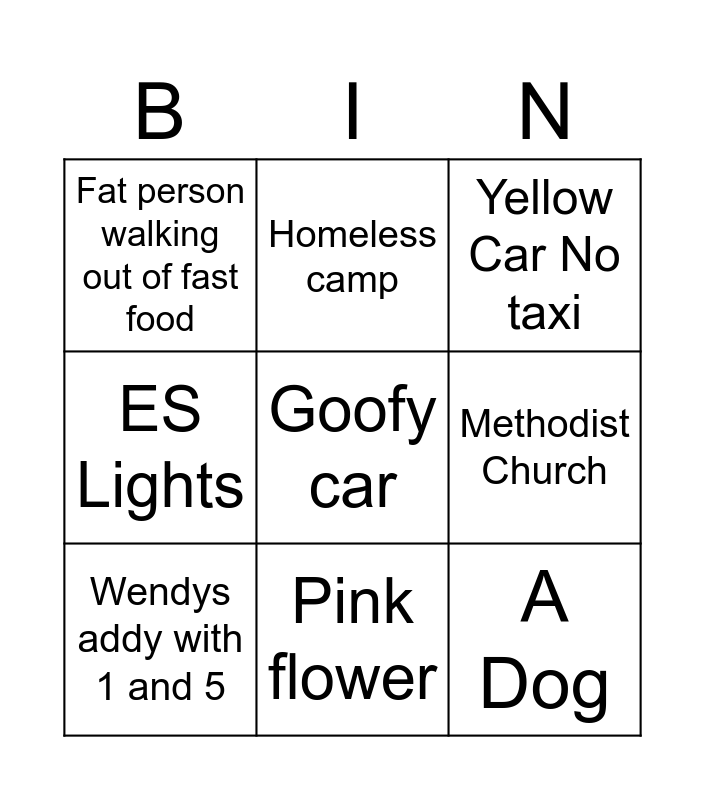 This bingo card has a free space and 8 words: Methodist Church, Yellow Car No taxi, Homeless camp, Wendys addy with 1 and 5, Fat person walking out of fast food, A Dog, ES Lights and Pink flower.
