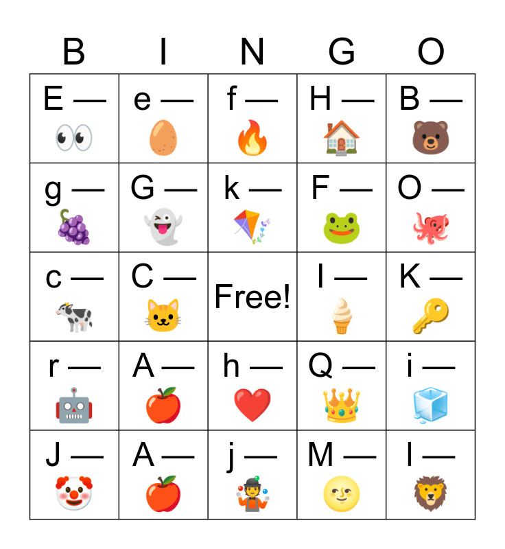 This bingo card has a free space and 30 words: A โ ๐, b โ ๐, C โ ๐ฑ, d โ ๐ถ, E โ ๐, f โ ๐ฅ, G โ ๐ป, h โ โค๏ธ, I โ ๐ฆ, j โ ๐คน, K โ ๐, l โ ๐ฆ, M โ ๐, n โ ๐, O โ ๐, p โ ๐ง, Q โ ๐, r โ ๐ค, A โ ๐, B โ ๐ป, c โ ๐, D โ ๐ฆ, e โ ๐ฅ, F โ ๐ธ, g โ ๐, H โ ๐ , i โ ๐ง, J โ ๐คก, k โ ๐ช and R โ ๐.