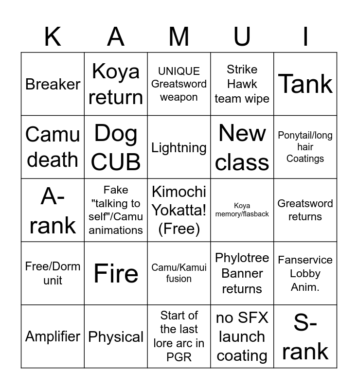 This bingo card has a free space and 24 words: Fire, Physical, Lightning, Amplifier, Tank, Breaker, Camu death, Koya return, Koya memory/flasback, Camu/Kamui fusion, New class, A-rank, Phylotree Banner returns, Fanservice Lobby Anim., Dog CUB, no SFX launch coating, Greatsword returns, UNIQUE Greatsword weapon, Ponytail/long hair Coatings, Fake "talking to self"/Camu animations, S-rank, Free/Dorm unit, Strike Hawk team wipe and Start of the last lore arc in PGR.