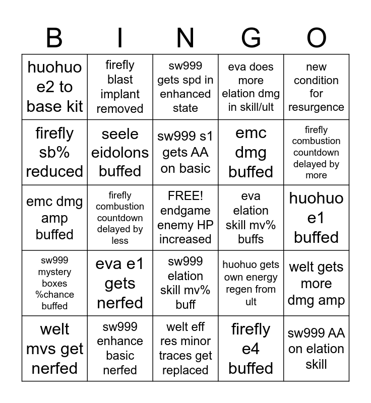 This bingo card has a free space and 24 words: eva e1 gets nerfed, sw999 enhance basic nerfed, sw999 s1 gets AA on basic, welt mvs get nerfed, new condition for resurgence, huohuo e2 to base kit, firefly sb% reduced, firefly blast implant removed, eva elation skill mv% buffs, sw999 elation skill mv% buff, emc dmg buffed, emc dmg amp buffed, huohuo gets own energy regen from ult, welt gets more dmg amp, seele eidolons buffed, firefly e4 buffed, huohuo e1 buffed, sw999 gets spd in enhanced state, firefly combustion countdown delayed by more, firefly combustion countdown delayed by less, sw999 AA on elation skill, sw999 mystery boxes %chance buffed, eva does more elation dmg in skill/ult and welt eff res minor traces get replaced.
