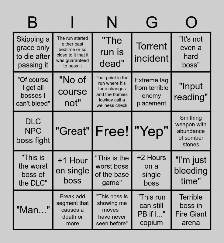 This bingo card has a free space and 26 words: "This is the worst boss of the base game", "This run can still PB if I..." copium, That point in the run where his tone changes and the homies lowkey call a wellness check, Freak add segment that causes a death or more, "It's not even a hard boss", Skipping a grace only to die after passing it, "Of course I get all bosses I can't bleed", The run started either past bedtime or so close to it that it was guaranteed to pass it, Smithing weapon with abundance of somber stones, +2 Hours on a single boss, Extreme lag from terrible enemy placement, DLC NPC boss fight, "I'm just bleeding time", "Man...", "Great", Somber weapon with abundance of smithing stones, Torrent incident, "This is the worst boss of the DLC", "The run is dead", Terrible boss in Fire Giant arena, "Input reading", "This boss is showing me moves I have never seen before", "Yep", +1 Hour on single boss, "No of course not" and "Hello? Why is this guy so...?".