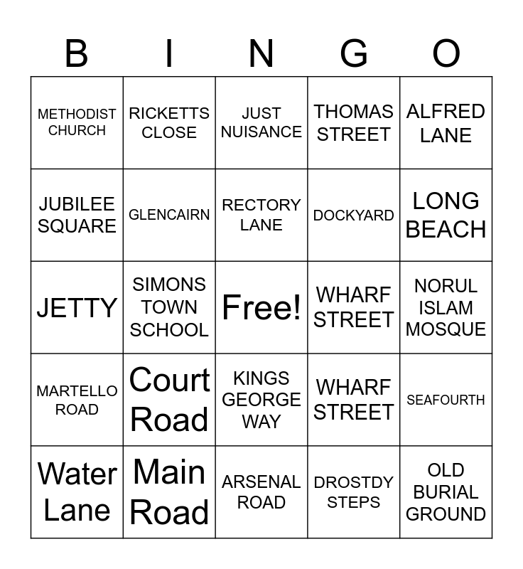 This bingo card has a free space and 24 words: Court Road, Main Road, RECTORY LANE, Water Lane, ALFRED LANE, METHODIST CHURCH, JUBILEE SQUARE, RICKETTS CLOSE, WHARF STREET, KINGS GEORGE WAY, DOCKYARD, JETTY, WHARF STREET, SEAFOURTH, GLENCAIRN, DROSTDY STEPS, NORUL ISLAM MOSQUE, JUST NUISANCE, LONG BEACH, SIMONS TOWN SCHOOL, OLD BURIAL GROUND, MARTELLO ROAD, THOMAS STREET and ARSENAL ROAD.