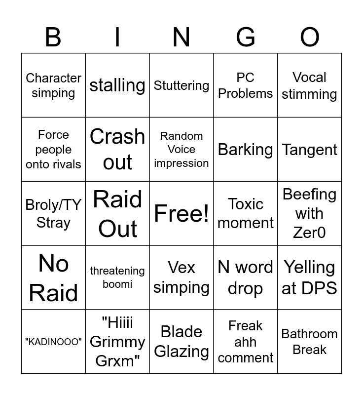 This bingo card has a free space and 24 words: threatening boomi, "Hiiii Grimmy Grxm", Random Voice impression, "KADINOOO", Vocal stimming, Character simping, Force people onto rivals, stalling, Toxic moment, Vex simping, Barking, Broly/TY Stray, N word drop, Yelling at DPS, Crash out, Freak ahh comment, Beefing with Zer0, Stuttering, Tangent, Raid Out, Bathroom Break, No Raid, PC Problems and Blade Glazing.