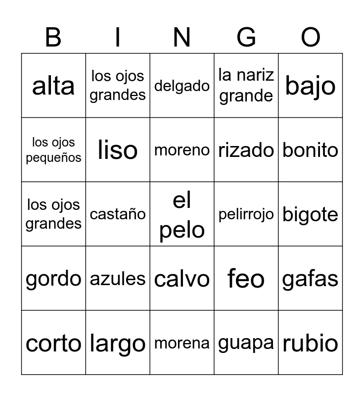 This bingo card has a free space and 24 words: azules, largo, moreno, corto, bajo, alta, los ojos pequeños, los ojos grandes, pelirrojo, calvo, rizado, los ojos grandes, feo, gafas, liso, guapa, bigote, delgado, bonito, castaño, rubio, gordo, la nariz grande and morena.