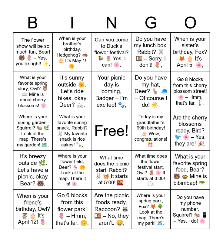 This bingo card has a free space and 33 words: What is your favorite spring treat, Squirrel? 🐿️ My favorite treat is strawberry mochi! 🍓,, What is your favorite spring drink, Deer? 🦌 My favorite drink is green tea! 🍵,, What is your favorite spring snack, Rabbit? 🐰 My favorite snack is rice cakes! 🍡,, It’s warm outside ☀️. Let’s see the cherry blossoms, okay Squirrel? 🌸,, It’s breezy outside 🌿. Let’s have a picnic, okay Bear? 🐻,, It’s sunny outside 🌞. Let’s ride bikes, okay Deer? 🚲,, When is your sister’s birthday, Fox? 🦊 🎂 It’s April 5! 🌸,, When is your friend’s birthday, Owl? 🦉 🎂 It’s April 12! 🌷,, When is your brother’s birthday, Hedgehog? 🦔 🎂 It’s May 1! 🌼,, Your spring festival is coming, Raccoon – I’m happy about that! 🦝✨,, Your picnic day is coming, Badger – I’m excited! 🐾,, Can you come to Duck’s flower festival? 🦆 🌷 Yes, I can! 🌸,, Can you come to Frog’s picnic party? 🐸 🧺 No, I can’t make it. 😅,, Today is my grandmother’s 100th birthday! 🎂 Wow, congratulations! 🎉,, Today is my grandfather’s 99th birthday! 🎂 Wow, congratulations! 🎊,, Go 8 blocks from this cherry blossom street! 🌸 – Hmm, that’s far. 🚶,, Go 6 blocks from this flower park! 🌷 – Hmm, that’s far. 🌼,, Where is your spring garden, Squirrel? 🐿️ 🌿 Look at the map. There’s my garden! 🗺️,, Where is your flower field, Deer? 🦌 🌼 Look at the map. There it is! 🌸,, What time does the flower festival start, Owl? 🦉 🌸 It starts at 3:00! 🕒,, What time does the picnic start, Rabbit? 🐰 🧺 It starts at 5:00! 🌇,, The spring carnival will be so much fun, Fox! 🦊 🌸 – Yes, you’re right! 🎉,, The flower show will be so much fun, Bear! 🐻 🌷 – Yes, you’re right! ✨,, Are the cherry blossoms ready, Bird? 🐦 🌸 – Yes, they are! 🎉,, Are the picnic foods ready, Raccoon? 🦝 🍱 – No, they aren’t. 😅,, Do you have my phone number, Squirrel? 🐿️ 📱 – Yes, I do! 🌸,, Do you have my lunch box, Rabbit? 🐰 🍱 – Sorry, I don't! 🌷,, Do you have my hat, Deer? 🦌 🧢 – Of course I do! ☀️,, What is your favorite spring story, Owl? 🦉 📖 Mine is about cherry blossoms! 🌸,, What is your favorite spring food, Bear? 🐻 🍲 Mine is bibimbap! 🥗,, What is your favorite spring sound, Bird? 🐦 🎶 Mine is birds singing! 🌿,, Where is your spring park, Fox? 🦊 🌳 Look at the map. There’s my park! 🗺️, and Your spring festival is coming, Raccoon – So I’m happy about that! 🦝🌸🎉.
