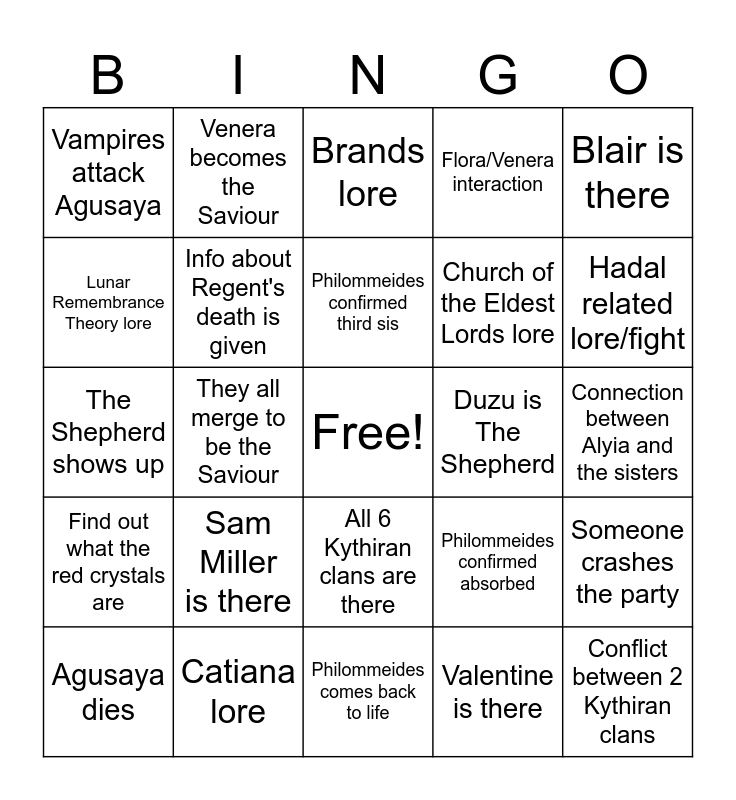 This bingo card has a free space and 24 words: Sam Miller is there, Catiana lore, Philommeides confirmed third sis, Agusaya dies, Blair is there, Vampires attack Agusaya, Lunar Remembrance Theory lore, Venera becomes the Saviour, Duzu is The Shepherd, All 6 Kythiran clans are there, Church of the Eldest Lords lore, The Shepherd shows up, Philommeides confirmed absorbed, Someone crashes the party, Info about Regent's death is given, Valentine is there, Connection between Alyia and the sisters, Brands lore, Hadal related lore/fight, They all merge to be the Saviour, Conflict between 2 Kythiran clans, Find out what the red crystals are, Flora/Venera interaction and Philommeides comes back to life.