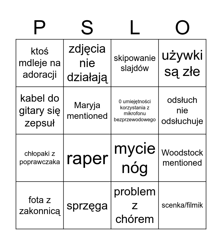 This bingo card has 16 words: sprzęga, Woodstock mentioned, skipowanie slajdów, ktoś mdleje na adoracji, chłopaki z poprawczaka, zdjęcia nie działają, mycie nóg, problem z chórem, kabel do gitary się zepsuł, Maryja mentioned, fota z zakonnicą, używki są złe, raper, odsłuch nie odsłuchuje, 0 umiejętności korzystania z mikrofonu bezprzewodowego and scenka/filmik.