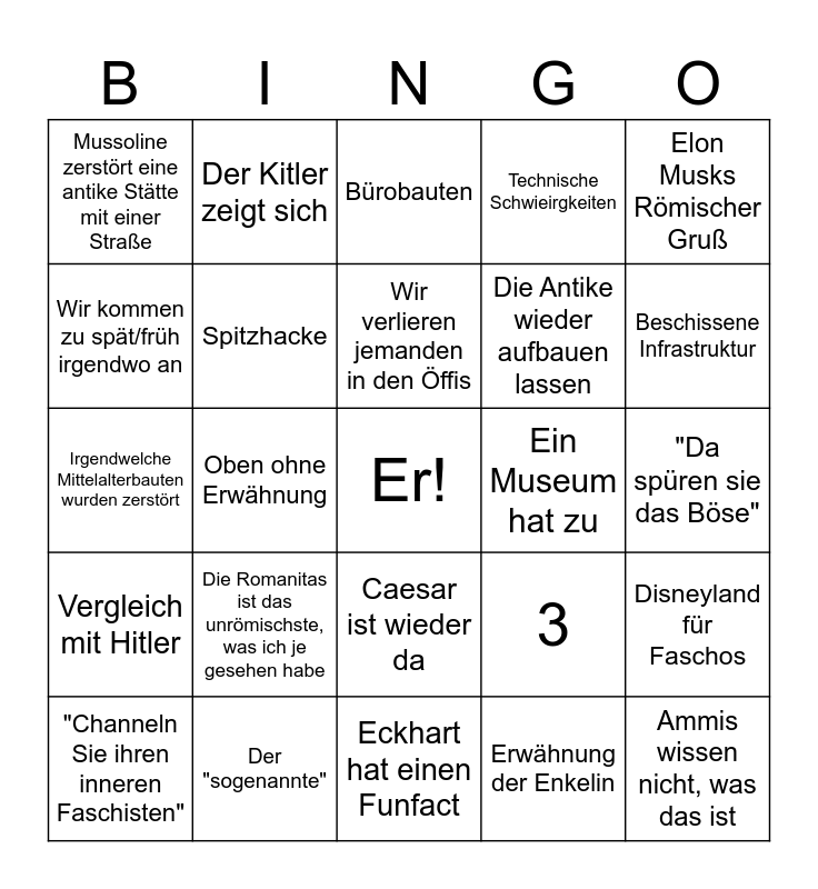 This bingo card has a free space and 24 words: Die Romanitas ist das unrömischste, was ich je gesehen habe, Der "sogenannte", Wir verlieren jemanden in den Öffis, "Channeln Sie ihren inneren Faschisten", Elon Musks Römischer Gruß, Mussoline zerstört eine antike Stätte mit einer Straße, Wir kommen zu spät/früh irgendwo an, Der Kitler zeigt sich, Ein Museum hat zu, Caesar ist wieder da, Die Antike wieder aufbauen lassen, Irgendwelche Mittelalterbauten wurden zerstört, 3, Disneyland für Faschos, Spitzhacke, Erwähnung der Enkelin, "Da spüren sie das Böse", Bürobauten, Beschissene Infrastruktur, Oben ohne Erwähnung, Ammis wissen nicht, was das ist, Vergleich mit Hitler, Technische Schwieirgkeiten and Eckhart hat einen Funfact.