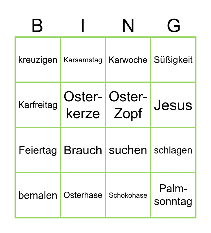 This bingo card has 52 words: Ostern, Karsamstag, Gottesdienst, Kätzchen, Kirche, Eier färben, Oster- Zopf, Palmsonntag, kreuzigen, Grün- donnerstag, suchen, Oster- feuer, Huhn, Osterhase, Küken, Lamm, Karfreitag, Oster- kerze, Peitsche, schlagen, bemalen, Henne, Karwoche, Palm- sonntag, Familie, Schokolade, Auferstehung, Korb, Feiertag, Kaninchen, Oster Nacht, Jesus, feiern, Schleife, Gras, Süßigkeit, Fasching, fasten, Tod, Glocke, Fleisch, Brauch, Schokohase, Frühling, hellgrün, dunkelbraun, Streifen, Hefe, Bohnen, Mehl, Aschermittwoch and Karsamsta/0/g.