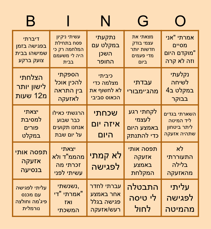 This bingo card has 57 words: מאגר משפטים לבינגו, עליתי לפגישה עם מכנס פיג'מה וחולצה נורמלית, פתחתי מצלמה רק לשנייה כדי שיראו שאני "שם", דיברתי בפגישה בזמן שמישהו בבית צועק ברקע, עברתי לחדר אחר באמצע פגישה בגלל רעש/אזעקה, השתמשתי בתירוץ "בעיות אינטרנט" כדי לקנות זמן, הספקתי להכין אוכל בין התראה לאזעקה, עצרתי שיחת עבודה בגלל אזעקה, עבדתי מהג׳ימבורי, לקחתי את הלפטופ לממ"ד "רק לשתי דקות" ונשארתי לעבוד, מצאתי את עצמי בודק חדשות יותר מדי פעמים ביום, אני נכנס לאינסטגרם להתעדכן ומוצא את עצמי גולל יותר משעה, הייתי עם אותה פיג'מה 5 לילות, לא החלפתי מפיג׳מה לבגדים רגילים 5 ימים, הכנתי אוכל תוך כדי שיחת עבודה, ויתרתי על מקלחת "כי אין כוח היום", אמרתי "אני מסיים מוקדם היום" וזה לא קרה, הרגשתי כאילו כבר שבוע אנחנו תקועים על יום שבת, שתיתי יותר קפה מהרגיל, שכחתי איזה יום היום, לקחתי רגע לעצמי באמצע היום כדי להתנתק, שקלתי לעבוד מהממ"ד גם בלי אזעקה רק כדי לקבל קצת שקט, תפסה אותי אזעקה באמצע המקלחת, נתקעתי במקלט עם השכן החופר, הספקתי לריב עם עם כל אחד מבני הבית, כיביתי מצלמה כדי לא לחשוף את הכאוס סביבי, עברתי למיוט כדי לצעוק בבית וחזרתי כאילו כלום, לא חפפתי את השיער כי פחדתי שתהיה אזעקה באמצע המקלחת, נקלעתי לשיחה במקלט ב4 בבוקר, שיחקנו את כל המשחקי קופסה שיש בבית, סיימתי את כל מגירת הממתקים של הבית, פתחתי את המקרר בלי לדעת מה אני מחפש, התעוררתי כמה פעמים בלילה בלי סיבה רק כי חשבתי שאולי תהיה אזעקה, שכחתי שאני צריך לעלות לפגישה, השארתי בגדים ליד המיטה ליתר ביטחון שתהיה אזעקה, הצלחתי לישון יותר מ12 שעות, התחלתי וסיימתי לראות סדרה חדשה, יצאתי למסיבת פורים במקלט, אירחתי חברים/ משפחה שאין להם מקלט בבית, תפסה אותי אזעקה בנסיעה, עשיתי ניקיון פסח בתחילת המלחמה רק כי היה לי משעמם בבית, לא קמתי לפגישה, עליתי לפגישה מהמיטה, נשארתי על מיוט כל הפגישה ושכחתי שאני בכלל שם, רצתי לממ"ד עם חצי כוס קפה ושפכתי בדרך, לקחתי איתי יותר מדי דברים לממ"ד "למקרה ש…", יצאתי מהממ"ד ולא זכרתי מה עשיתי לפני, נשנשתי, אמרתי "די" ואז המשכתי, הנהנתי בפגישה למרות שלא הייתי מרוכז, עשיתי קנייה רגשית של דברים שאני לא צריך, נתקעה לי חבילה מחול שהזמנתי, התבטלה לי טיסה לחול, נתקעתי בחול, נרדמתי תוך כדי שעבדתי, אחד השכנים התחיל איתי שיחה בממד והמשיך אותה גם אחרי שיצאנו, לא התעוררתי בלילה מהאזעקה and עליתי לדיילי לפני שצחצחתי שיניים.