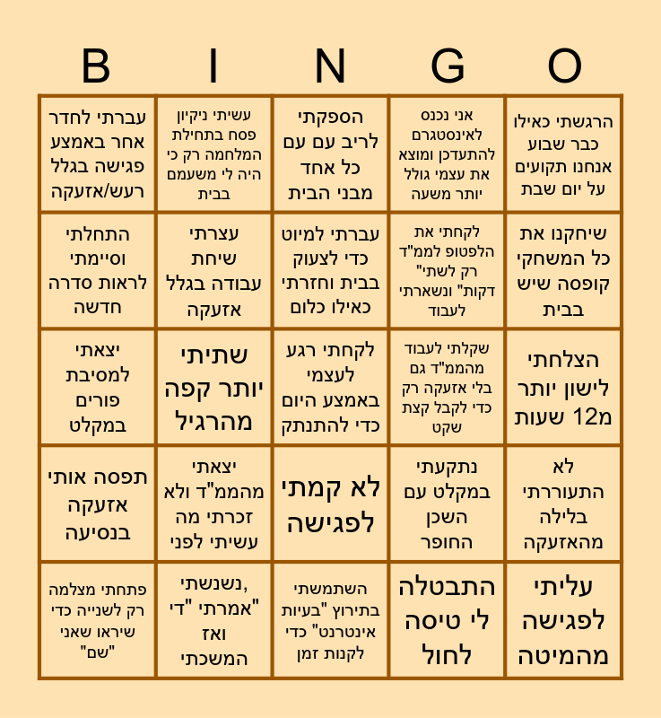 This bingo card has 56 words: עליתי לפגישה עם מכנס פיג'מה וחולצה נורמלית, פתחתי מצלמה רק לשנייה כדי שיראו שאני "שם", דיברתי בפגישה בזמן שמישהו בבית צועק ברקע, עברתי לחדר אחר באמצע פגישה בגלל רעש/אזעקה, השתמשתי בתירוץ "בעיות אינטרנט" כדי לקנות זמן, הספקתי להכין אוכל בין התראה לאזעקה, עצרתי שיחת עבודה בגלל אזעקה, עבדתי מהג׳ימבורי, לקחתי את הלפטופ לממ"ד "רק לשתי דקות" ונשארתי לעבוד, מצאתי את עצמי בודק חדשות יותר מדי פעמים ביום, אני נכנס לאינסטגרם להתעדכן ומוצא את עצמי גולל יותר משעה, הייתי עם אותה פיג'מה 5 לילות, לא החלפתי מפיג׳מה לבגדים רגילים 5 ימים, הכנתי אוכל תוך כדי שיחת עבודה, ויתרתי על מקלחת "כי אין כוח היום", אמרתי "אני מסיים מוקדם היום" וזה לא קרה, הרגשתי כאילו כבר שבוע אנחנו תקועים על יום שבת, שתיתי יותר קפה מהרגיל, שכחתי איזה יום היום, לקחתי רגע לעצמי באמצע היום כדי להתנתק, שקלתי לעבוד מהממ"ד גם בלי אזעקה רק כדי לקבל קצת שקט, תפסה אותי אזעקה באמצע המקלחת, נתקעתי במקלט עם השכן החופר, הספקתי לריב עם עם כל אחד מבני הבית, כיביתי מצלמה כדי לא לחשוף את הכאוס סביבי, עברתי למיוט כדי לצעוק בבית וחזרתי כאילו כלום, לא חפפתי את השיער כי פחדתי שתהיה אזעקה באמצע המקלחת, נקלעתי לשיחה במקלט ב4 בבוקר, שיחקנו את כל המשחקי קופסה שיש בבית, סיימתי את כל מגירת הממתקים של הבית, פתחתי את המקרר בלי לדעת מה אני מחפש, התעוררתי כמה פעמים בלילה בלי סיבה רק כי חשבתי שאולי תהיה אזעקה, שכחתי שאני צריך לעלות לפגישה, השארתי בגדים ליד המיטה ליתר ביטחון שתהיה אזעקה, הצלחתי לישון יותר מ12 שעות, התחלתי וסיימתי לראות סדרה חדשה, יצאתי למסיבת פורים במקלט, אירחתי חברים/ משפחה שאין להם מקלט בבית, תפסה אותי אזעקה בנסיעה, עשיתי ניקיון פסח בתחילת המלחמה רק כי היה לי משעמם בבית, לא קמתי לפגישה, עליתי לפגישה מהמיטה, נשארתי על מיוט כל הפגישה ושכחתי שאני בכלל שם, רצתי לממ"ד עם חצי כוס קפה ושפכתי בדרך, לקחתי איתי יותר מדי דברים לממ"ד "למקרה ש…", יצאתי מהממ"ד ולא זכרתי מה עשיתי לפני, נשנשתי, אמרתי "די" ואז המשכתי, הנהנתי בפגישה למרות שלא הייתי מרוכז, עשיתי קנייה רגשית של דברים שאני לא צריך, נתקעה לי חבילה מחול שהזמנתי, התבטלה לי טיסה לחול, נתקעתי בחול, נרדמתי תוך כדי שעבדתי, אחד השכנים התחיל איתי שיחה בממד והמשיך אותה גם אחרי שיצאנו, לא התעוררתי בלילה מהאזעקה and עליתי לדיילי לפני שצחצחתי שיניים.