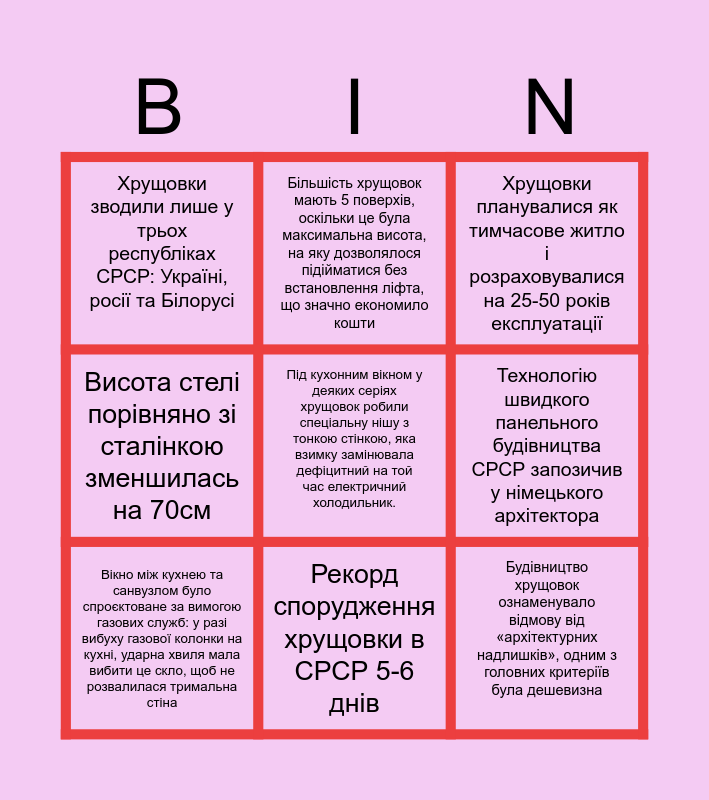 This bingo card has a free space and 8 words: Технологію швидкого панельного будівництва СРСР запозичив у німецького архітектора, Хрущовки планувалися як тимчасове житло і розраховувалися на 25-50 років експлуатації, Більшість хрущовок мають 5 поверхів, оскільки це була максимальна висота, на яку дозволялося підійматися без встановлення ліфта, що значно економило кошти, Вікно між кухнею та санвузлом було спроєктоване за вимогою газових служб: у разі вибуху газової колонки на кухні, ударна хвиля мала вибити це скло, щоб не розвалилася тримальна стіна, Хрущовки зводили лише у трьох республіках СРСР: Україні, росії та Білорусі, Будівництво хрущовок ознаменувало відмову від «архітектурних надлишків», одним з головних критеріїв була дешевизна, Висота стелі порівняно зі сталінкою зменшилась на 70см and Рекорд спорудження хрущовки в СРСР 5-6 днів.