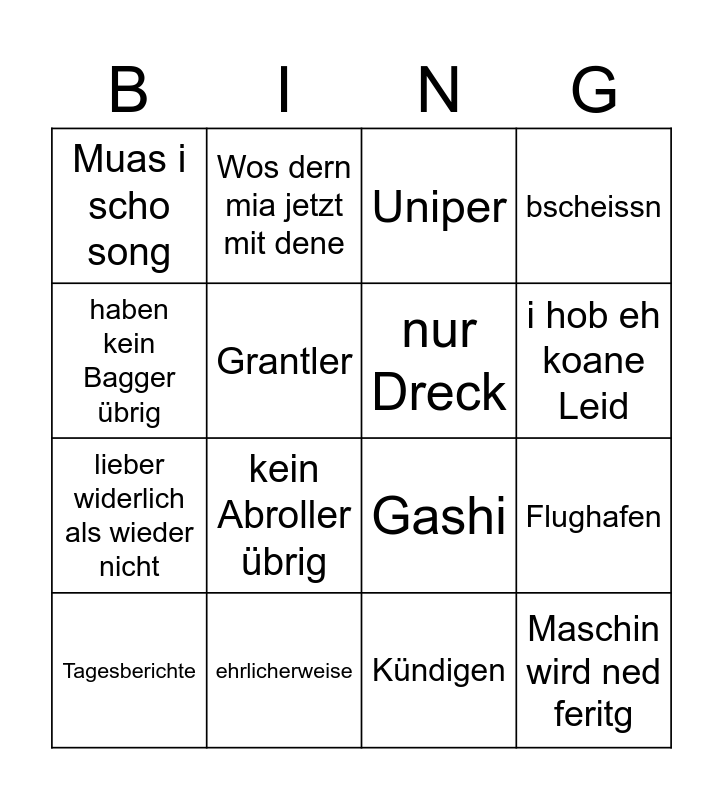 This bingo card has 16 words: ehrlicherweise, Flughafen, Uniper, Muas i scho song, lieber widerlich als wieder nicht, Wos dern mia jetzt mit dene, Gashi, Kündigen, haben kein Bagger übrig, Grantler, Tagesberichte, bscheissn, kein Abroller übrig, i hob eh koane Leid, nur Dreck and Maschin wird ned feritg.