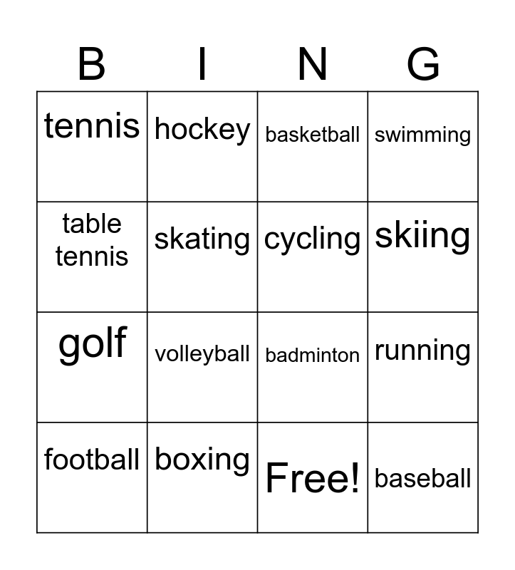 This bingo card has 17 words: Free!, football, basketball, tennis, volleyball, swimming, running, cycling, skiing, skating, boxing, badminton, table tennis, hockey, golf, rugby and baseball.