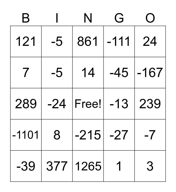 This bingo card has a free space and 53 words: 2, 3, -1, 1, 8, 8, -5, 10, 7, -9, -5, -4, -7, -27, 22, -39, 14, -13, 67, 24, -24, 16, -45, 121, -83, 377, -582, -898, 426, -167, 1000, -247, -119, -379, -1191, 27, -111, 1265, 861, -899, 425, -1000, 239, -285, 1115, -215, -195, -257, 289, -1101, 229, -354 and 900.