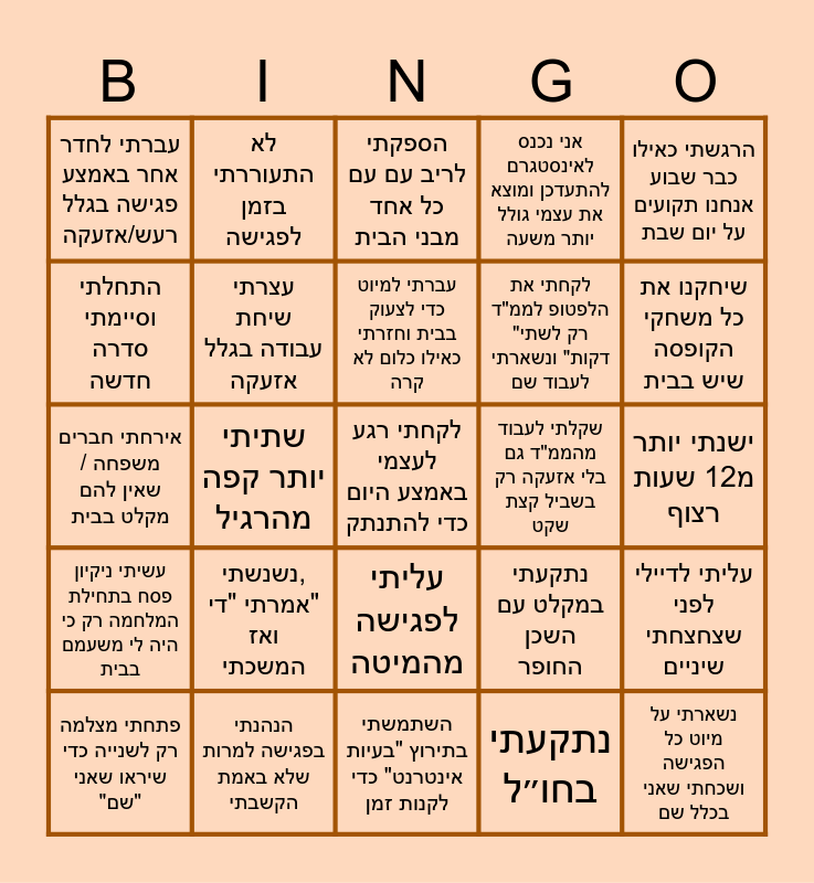 This bingo card has 57 words: עליתי לפגישה עם מכנס פיג'מה וחולצה נורמלית, פתחתי מצלמה רק לשנייה כדי שיראו שאני "שם", דיברתי בפגישה בזמן שמישהו בבית צועק ברקע, עברתי לחדר אחר באמצע פגישה בגלל רעש/אזעקה, השתמשתי בתירוץ "בעיות אינטרנט" כדי לקנות זמן, הספקתי להכין אוכל בין התראה לאזעקה, עצרתי שיחת עבודה בגלל אזעקה, עבדתי מהג׳ימבורי, לקחתי את הלפטופ לממ"ד "רק לשתי דקות" ונשארתי לעבוד שם, מצאתי את עצמי בודק חדשות יותר מדי פעמים ביום, אני נכנס לאינסטגרם להתעדכן ומוצא את עצמי גולל יותר משעה, הייתי עם אותה פיג'מה 5 לילות ברצף, לא החלפתי מפיג׳מה לבגדים רגילים 5 ימים, הכנתי אוכל תוך כדי שיחת עבודה, ויתרתי על מקלחת "כי אין לי כוח היום", אמרתי "אני מסיים מוקדם היום" וזה לא קרה, הרגשתי כאילו כבר שבוע אנחנו תקועים על יום שבת, שתיתי יותר קפה מהרגיל, שכחתי איזה יום היום, לקחתי רגע לעצמי באמצע היום כדי להתנתק, שקלתי לעבוד מהממ"ד גם בלי אזעקה רק בשביל קצת שקט, תפסה אותי אזעקה באמצע המקלחת, נתקעתי במקלט עם השכן החופר, הספקתי לריב עם עם כל אחד מבני הבית, כיביתי מצלמה כדי לא לחשוף את הכאוס סביבי, עברתי למיוט כדי לצעוק בבית וחזרתי כאילו כלום לא קרה, לא חפפתי את השיער כי פחדתי שתהיה אזעקה באמצע המקלחת, נקלעתי לשיחה במקלט ב4 בבוקר, שיחקנו את כל משחקי הקופסה שיש בבית, סיימתי את כל מגירת הממתקים של הבית, פתחתי את המקרר בלי לדעת מה אני מחפש, התעוררתי כמה פעמים בלילה בלי סיבה רק כי חשבתי שאולי תהיה אזעקה, שכחתי שאני צריך לעלות לפגישה, השארתי בגדים ליד המיטה למקרה שתהיה אזעקה, ישנתי יותר מ12 שעות רצוף, התחלתי וסיימתי סדרה חדשה, יצאתי למסיבת פורים במקלט, אירחתי חברים / משפחה שאין להם מקלט בבית, תפסה אותי אזעקה בנסיעה, עשיתי ניקיון פסח בתחילת המלחמה רק כי היה לי משעמם בבית, לא התעוררתי בזמן לפגישה, עליתי לפגישה מהמיטה, נשארתי על מיוט כל הפגישה ושכחתי שאני בכלל שם, רצתי לממ"ד עם כוס קפה ושפכתי בדרך, לקחתי איתי יותר מדי דברים לממ"ד "למקרה ש…", יצאתי מהממ"ד ולא זכרתי מה עשיתי לפני, נשנשתי, אמרתי "די" ואז המשכתי, הנהנתי בפגישה למרות שלא באמת הקשבתי, עשיתי קנייה רגשית של דברים שאני לא צריך, נתקעה לי חבילה שהזמנתי מחו״ל, התבטלה לי טיסה לחו״ל, נתקעתי בחו״ל, נרדמתי תוך כדי עבודה, אחד השכנים התחיל איתי שיחה בממד והמשיך אותה גם אחרי שיצאנו, לא התעוררתי בלילה מאזעקה, עליתי לדיילי לפני שצחצחתי שיניים and פתחתי בקבוק יין בשביל כוס אחת ונגמר לי הבקבוק.
