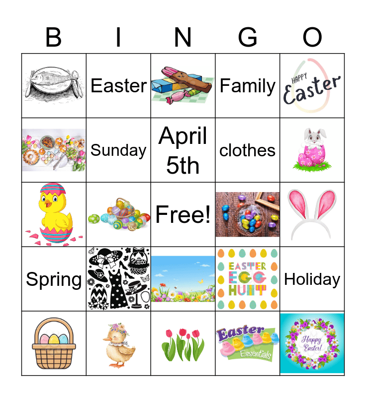 This bingo card has 21 images, a free space and 8 words: Sunday, Spring, clothes, Family, Easter, Holiday, April 5th and Sarris.