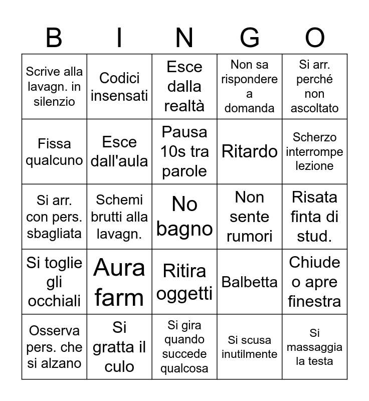 This bingo card has a free space and 24 words: Aura farm, Si gratta il culo, Pausa 10s tra parole, Osserva pers. che si alzano, Si arr. perché non ascoltato, Scrive alla lavagn. in silenzio, Fissa qualcuno, Codici insensati, Non sente rumori, Ritira oggetti, Ritardo, Si arr. con pers. sbagliata, Balbetta, Chiude o apre finestra, Esce dall'aula, Si scusa inutilmente, Risata finta di stud., Esce dalla realtà, Scherzo interrompe lezione, Schemi brutti alla lavagn., Si massaggia la testa, Si toglie gli occhiali, Non sa rispondere a domanda and Si gira quando succede qualcosa.