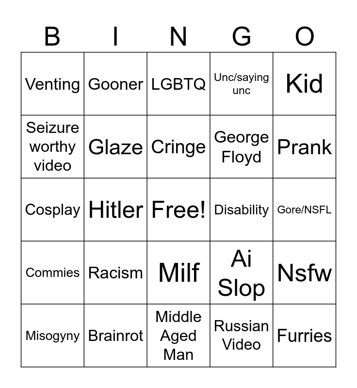This bingo card has a free space and 24 words: Racism, Brainrot, Cringe, Misogyny, Kid, Venting, Seizure worthy video, Gooner, Disability, Milf, George Floyd, Cosplay, Ai Slop, Nsfw, Glaze, Russian Video, Gore/NSFL, LGBTQ, Prank, Hitler, Furries, Commies, Unc/saying unc and Middle Aged Man.
