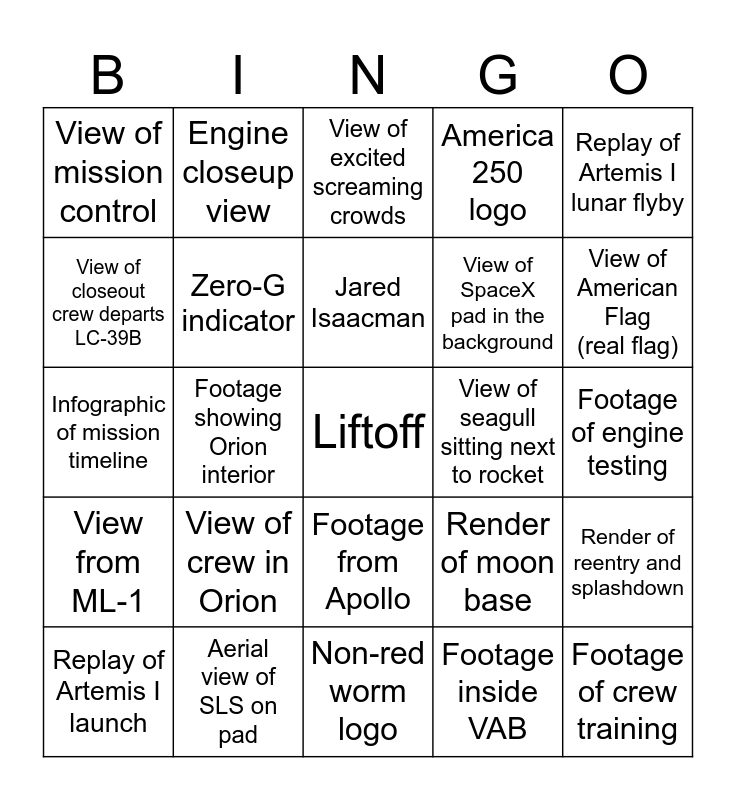 This bingo card has a free space and 24 words: View of crew in Orion, Aerial view of SLS on pad, Jared Isaacman, Replay of Artemis I launch, Replay of Artemis I lunar flyby, View of mission control, View of closeout crew departs LC-39B, Engine closeup view, View of seagull sitting next to rocket, Footage from Apollo, View of SpaceX pad in the background, Infographic of mission timeline, Render of moon base, Render of reentry and splashdown, Zero-G indicator, Footage inside VAB, Footage of engine testing, View of excited screaming crowds, View of American Flag (real flag), Footage showing Orion interior, Footage of crew training, View from ML-1, America 250 logo and Non-red worm logo.