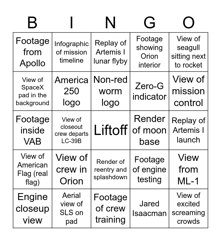 This bingo card has a free space and 24 words: View of crew in Orion, Aerial view of SLS on pad, Non-red worm logo, Engine closeup view, View of seagull sitting next to rocket, Footage from Apollo, View of SpaceX pad in the background, Infographic of mission timeline, Render of moon base, Render of reentry and splashdown, Zero-G indicator, Footage inside VAB, Footage of engine testing, View from ML-1, America 250 logo, Jared Isaacman, Replay of Artemis I launch, Replay of Artemis I lunar flyby, View of mission control, View of closeout crew departs LC-39B, View of excited screaming crowds, View of American Flag (real flag), Footage showing Orion interior and Footage of crew training.