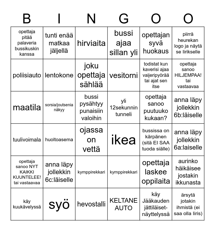 This bingo card has 36 words: kymppirekkari, kymppirekkari, KELTANE AUTO, poliisiauto, tuulivoimala, yli 12sekunnin tunneli, lentokone, hevostalli, opettajan syvä huokaus, opettaja laskee oppilaita, opettaja sanoo HILJEMPAA! tai vastaavaa, bussi ajaa sillan yli, aurinko häikäisee jostakin ikkunasta, sorsia/joutsenia näkyy, vesitorni, opettaja pitää palaveria bussikuskin kanssa, opettaja sanoo NYT KAIKKI KUUNTELEE! tai vastaavaa, opettaja sanoo puutuuko kukaan?, maatila, hirviaita, bussi pysähtyy punaisiin valoihin, huoltoasema, ikea, ojassa on vettä, bussissa on kärpänen (sitä EI SAA tuoda siälle), tunti enää matkaa jäljellä, todistat kun kaverisi ajaa vaijeripyörää tai ajat sen itse, syö, joku opettaja sählää, piirrä heurekan logo ja näytä se Iirikselle, ärsytä jotakin ihmistä (ei saa olla Iiris), käy kuukävelyssä, anna läpy jollekkin 6a:laiselle, anna läpy jollekkin 6b:läiselle, anna läpy jollekkin 6c:läiselle and käy Jääkauden jättiläiset-näyttelyssä.