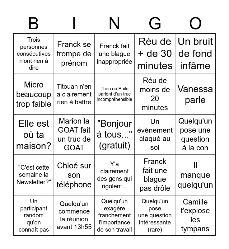 This bingo card has a free space and 24 words: Chloé sur son téléphone, Quelqu'un commence la réunion avant 13h55, Théo ou Philo parlent d'un truc incompréhensible, Un participant random qu'on connaît pas, Un bruit de fond infâme, Trois personnes consécutives n'ont rien à dire, Micro beaucoup trop faible, Franck se trompe de prénom, Un évènement claqué au sol, Y'a clairement des gens qui rigolent..., Réu de moins de 20 minutes, Elle est où ta maison?, Franck fait une blague pas drôle, Il manque quelqu'un, Titouan n'en a clairement rien à battre, Quelqu'un pose une question intéressante (rare), Quelqu'un pose une question à la con, Franck fait une blague inappropriée, Vanessa parle, Marion la GOAT fait un truc de GOAT, Camille t'explose les tympans, "C'est cette semaine la Newsletter?", Réu de + de 30 minutes and Quelqu'un exagère franchement l'importance de son travail.