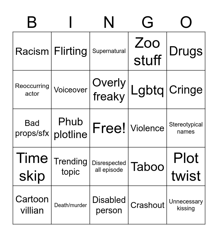 This bingo card has a free space and 24 words: Trending topic, Death/murder, Overly freaky, Cartoon villian, Drugs, Racism, Reoccurring actor, Flirting, Violence, Disrespected all episode, Lgbtq, Bad props/sfx, Taboo, Plot twist, Voiceover, Crashout, Stereotypical names, Supernatural, Cringe, Phub plotline, Unnecessary kissing, Time skip, Zoo stuff and Disabled person.