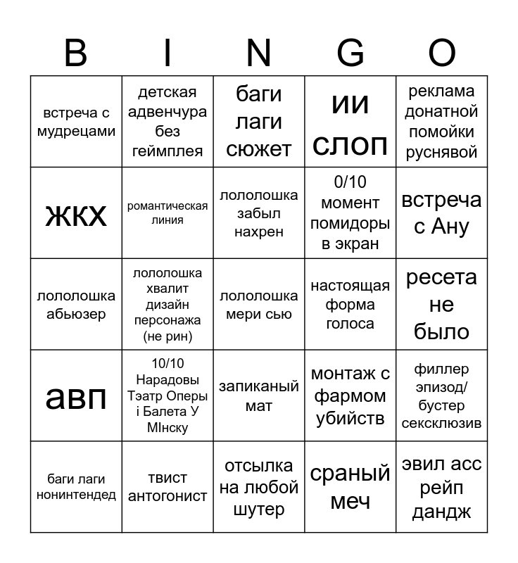 This bingo card has 25 words: 10/10 Нарадовы Тэатр Оперы i Балета У МIнску, отсылка на любой шутер, лололошка забыл нахрен, баги лаги нонинтендед, реклама донатной помойки руснявой, встреча с мудрецами, жкх, детская адвенчура без геймплея, настоящая форма голоса, запиканый мат, 0/10 момент помидоры в экран, лололошка абьюзер, монтаж с фармом убийств, филлер эпизод/бустер сексклюзив, романтическая линия, эвил асс рейп дандж, ресета не было, баги лаги сюжет, встреча с Ану, лололошка хвалит дизайн персонажа (не рин), лололошка мери сью, твист антогонист, авп, ии слоп and сраный меч.