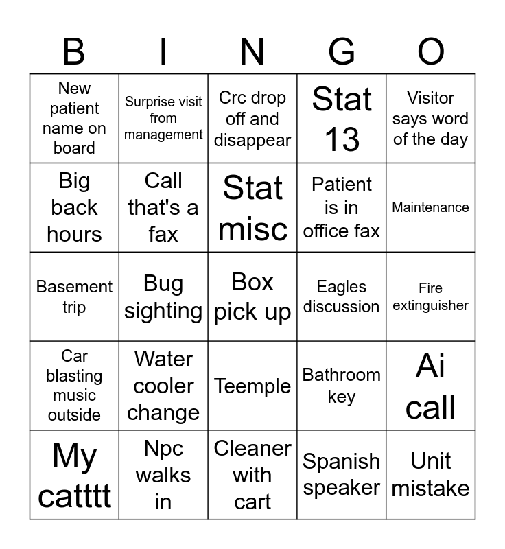 This bingo card has a free space and 24 words: Water cooler change, Npc walks in, Stat misc, My catttt, Visitor says word of the day, New patient name on board, Big back hours, Surprise visit from management, Eagles discussion, Teemple, Patient is in office fax, Basement trip, Bathroom key, Ai call, Call that's a fax, Spanish speaker, Fire extinguisher, Crc drop off and disappear, Maintenance, Bug sighting, Unit mistake, Car blasting music outside, Stat 13 and Cleaner with cart.