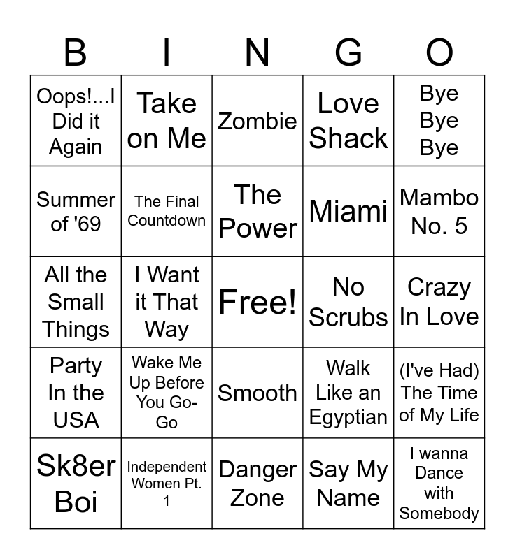 This bingo card has a free space and 50 words: Don't Stop Believin', I wanna Dance with Somebody, Africa, Danger Zone, Wake Me Up Before You Go-Go, Beat It, Take on Me, Livin' on A Prayer, Summer of '69, 9 to 5, The Final Countdown, Love Shack, (I've Had) The Time of My Life, Walk Like an Egyptian, Opposites Attract, Escapade, The Power, No Scrubs, ...Baby One More Time, Bye Bye Bye, I Want it That Way, Say My Name, Oops!...I Did it Again, Miami, Fantasy, Wannabe, Mambo No. 5, Be My Lover, Zombie, Smooth, Bitter Sweet Symphony, Let's Get Loud, November Rain, She's So High, Independent Women Pt. 1, All Star, Steal my Sunshine, C'est La Vie, Yeah!, Crazy In Love, Give Me Everything, I Gotta Feeling, Hips Don't Lie, Temperature, Sk8er Boi, All the Small Things, Sugar, We're going down, Since U Been Gone, Party In the USA and Single Ladies.