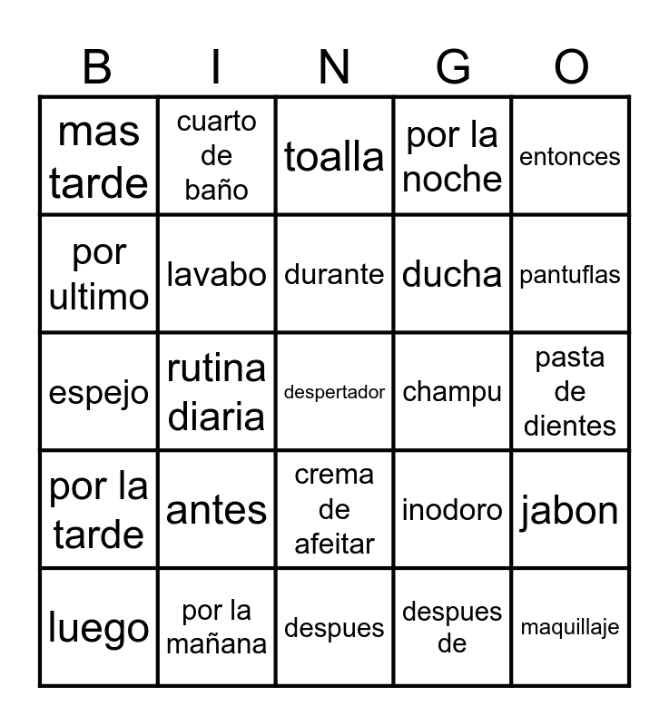 This bingo card has 25 words: antes, despues, durante, luego, entonces, mas tarde, por ultimo, cuarto de baño, champu, crema de afeitar, ducha, espejo, inodoro, jabon, lavabo, maquillaje, pasta de dientes, toalla, pantuflas, rutina diaria, despertador, por la mañana, por la tarde, por la noche and despues de.