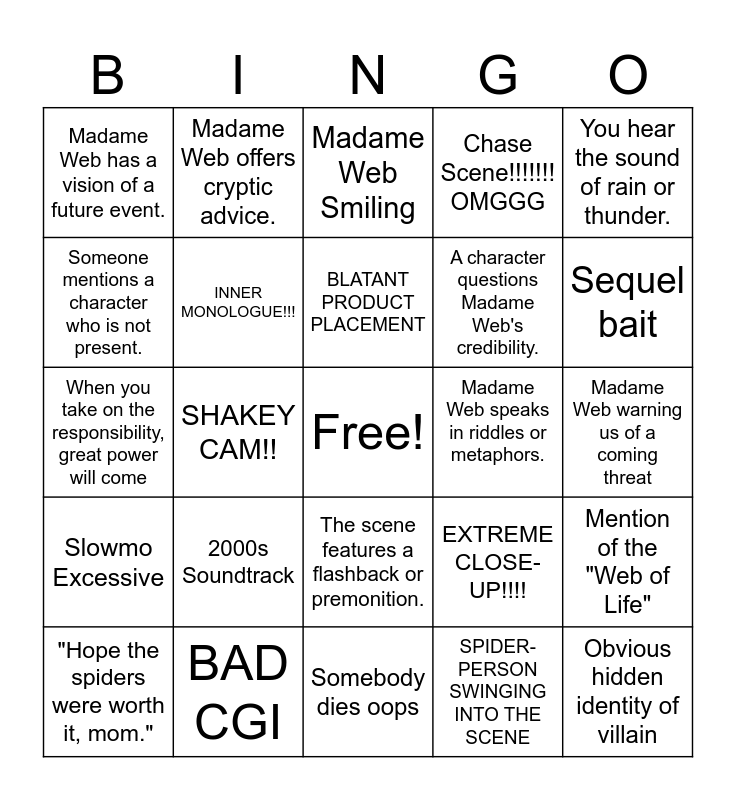 This bingo card has a free space and 24 words: 2000s Soundtrack, BAD CGI, BLATANT PRODUCT PLACEMENT, "Hope the spiders were worth it, mom.", You hear the sound of rain or thunder., Madame Web has a vision of a future event., Someone mentions a character who is not present., Madame Web offers cryptic advice., Madame Web speaks in riddles or metaphors., The scene features a flashback or premonition., A character questions Madame Web's credibility., When you take on the responsibility, great power will come, EXTREME CLOSE-UP!!!!, Mention of the "Web of Life", INNER MONOLOGUE!!!, SPIDER-PERSON SWINGING INTO THE SCENE, Madame Web warning us of a coming threat, Madame Web Smiling, Sequel bait, SHAKEY CAM!!, Obvious hidden identity of villain, Slowmo Excessive, Chase Scene!!!!!!! OMGGG and Somebody dies oops.