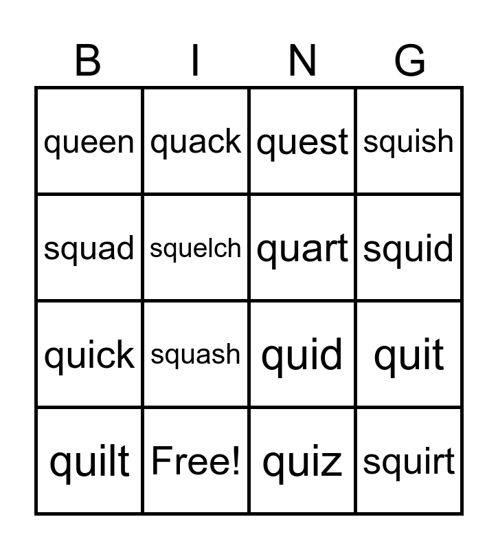 This bingo card has 16 words: Free!, quit, quest, queen, quick, quack, quid, quiz, squad, squelch, quilt, squish, squash, squid, quart and squirt.