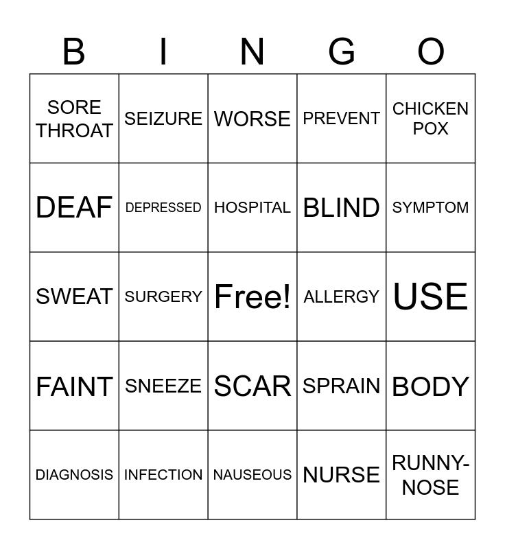 This bingo card has a free space and 34 words: CANCER, NURSE, DOCTOR, GLOVES, FAINT, DEPRESSED, CHICKEN POX, DIAGNOSIS, SEIZURE, PATIENT, HOSPITAL, WORSE, CHOKE, MEDICINE, ALLERGY, SYMPTOM, INFECTION, SWEAT, SNEEZE, SPRAIN, SCAR, CUT, SORE THROAT, USE, NAUSEOUS, RUNNY-NOSE, PREVENT, THROW-UP, BLIND, DEAF, INFORM, SURGERY, BODY and HEALTHY.