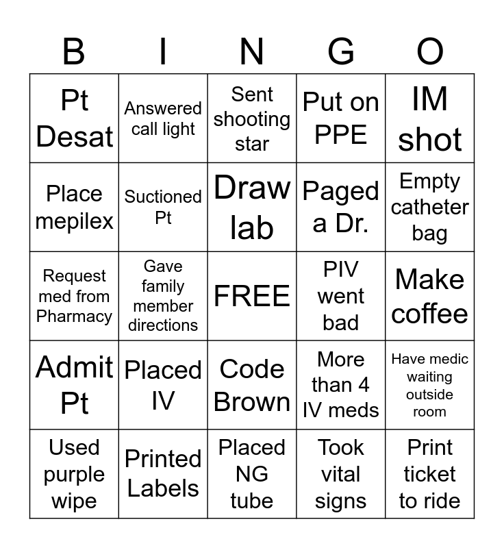 This bingo card has a free space and 24 words: Placed IV, Printed Labels, Draw lab, Used purple wipe, IM shot, Pt Desat, Place mepilex, Answered call light, PIV went bad, Code Brown, Paged a Dr., Request med from Pharmacy, More than 4 IV meds, Have medic waiting outside room, Suctioned Pt, Took vital signs, Make coffee, Sent shooting star, Empty catheter bag, Gave family member directions, Print ticket to ride, Admit Pt, Put on PPE and Placed NG tube.