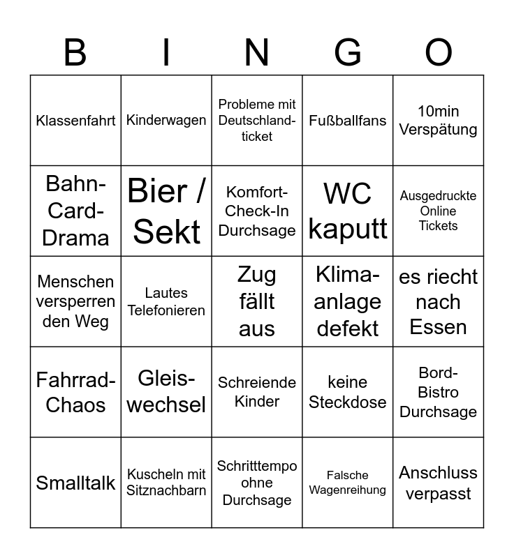 This bingo card has a free space and 24 words: Gleis-wechsel, Kuscheln mit Sitznachbarn, Komfort-Check-In Durchsage, Smalltalk, 10min Verspätung, Klassenfahrt, Bahn-Card-Drama, Kinderwagen, Klima-anlage defekt, Schreiende Kinder, WC kaputt, Menschen versperren den Weg, keine Steckdose, Bord-Bistro Durchsage, Bier / Sekt, Falsche Wagenreihung, es riecht nach Essen, Probleme mit Deutschland- ticket, Ausgedruckte Online Tickets, Lautes Telefonieren, Anschluss verpasst, Fahrrad-Chaos, Fußballfans and Schritttempo ohne Durchsage.