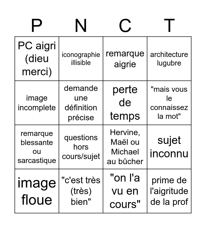 This bingo card has 16 words: "c'est très (très) bien", sujet inconnu, remarque aigrie, PC aigri (dieu merci), remarque blessante ou sarcastique, iconographie illisible, Hervine, Maël ou Michael au bûcher, "on l'a vu en cours", image incomplete, demande une définition précise, image floue, architecture lugubre, questions hors cours/sujet, "mais vous le connaissez la mot", perte de temps and prime de l'aigritude de la prof.